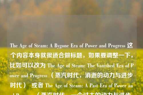 《蒸汽时代:逝去的动力与进步时代》探讨了蒸汽时代这一具有重大意义的历史阶段,蒸汽动力的出现带来了生产力的飞跃,推动了工业、交通等诸多领域的巨大变革,它见证了工厂兴起、铁路延伸、轮船远航等一系列进步,改变了人们的生产生活方式,塑造了现代世界的雏形,随着时代发展,蒸汽时代逐渐落幕,但它所代表的动力与进步精神,成为人类发展历程中不可磨灭的印记,为后续科技进步奠定了基础,其影响深远且值得深入研究与铭记。
