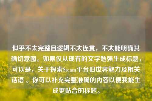 在当今数字化游戏的浪潮中,Steam 作为全球更大的数字游戏发行平台之一,汇聚了无数精彩纷呈的游戏,而其中,那些带有旧世界韵味的游戏宛如一颗颗璀璨的明珠,散发着独特的魅力,吸引着玩家们踏入那个充满历史与奇幻的世界。